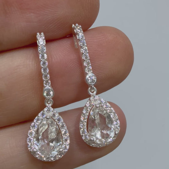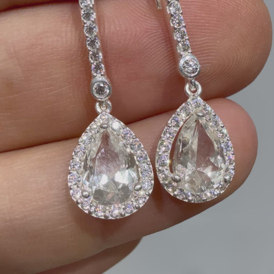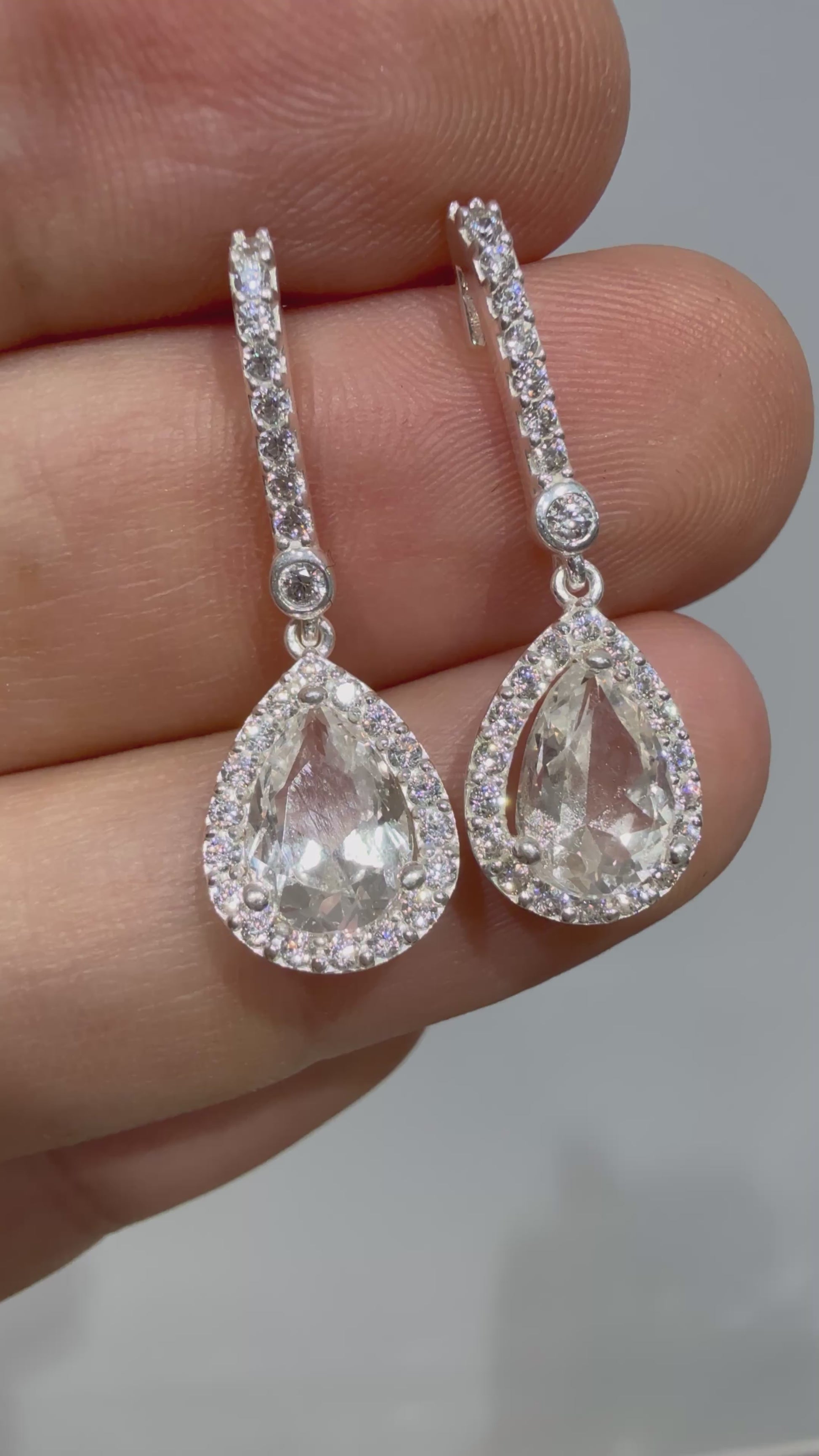 Pendientes de plata con topacio natural de 10x7mm que alcanzan 3,3cm de largo. Diseñados con acabado de alta joyería. Ideales para bodas y eventos especiales, Cada detalle ha sido cuidadosamente trabajado para garantizar un resultado impecable que complementará cualquier look nupcial.
