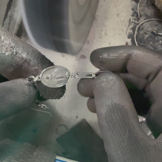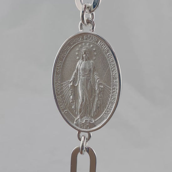La pulsera Virgen Milagrosa presenta un diseño único con una medalla de 32 mm, elaborada en material macizo que garantiza durabilidad. Su alta definición en los detalles permite una representación clara de la imagen, ofreciendo una pieza tanto ornamental como simbólica, ideal para la devoción diaria.