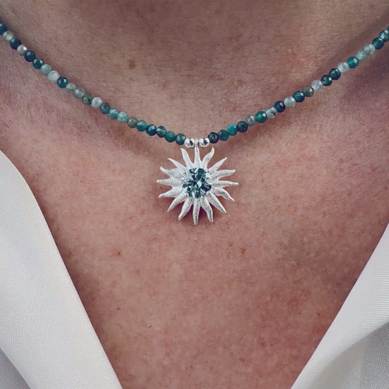 Este collar une la serenidad de las piedras naturales en tonos azules con un delicado sol de plata, trabajado a mano y engastado con una piedra color mint azul que refleja la luz de forma sutil.